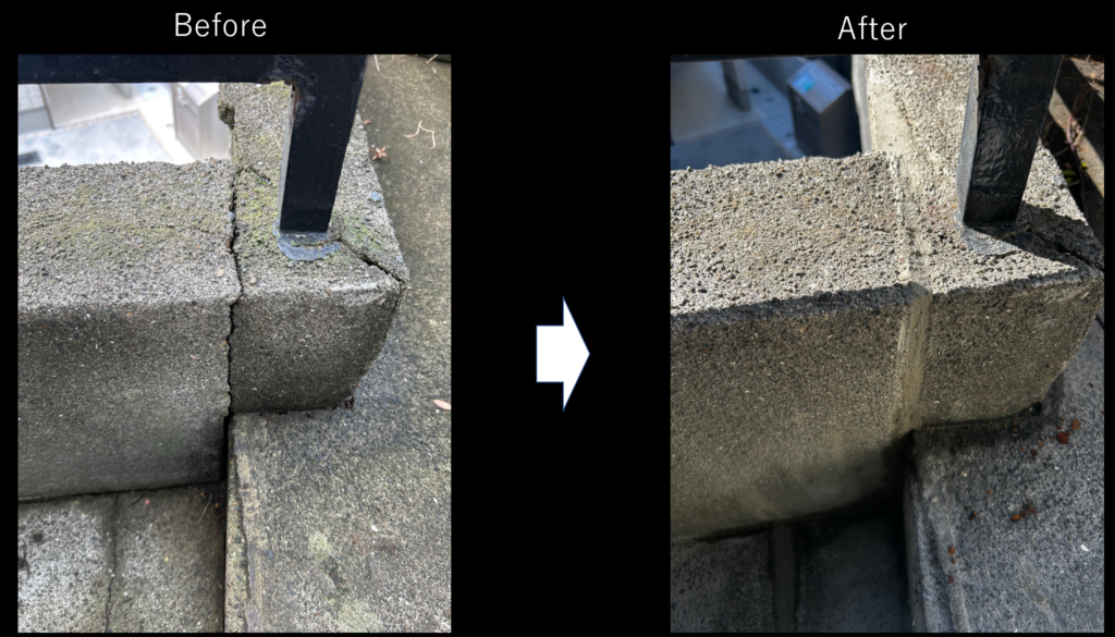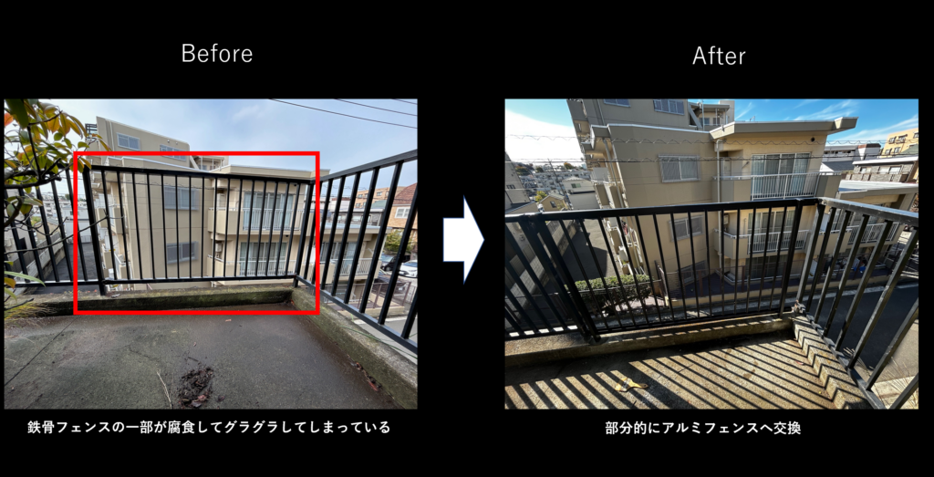 なるべく、既存の鉄骨フェンスと新規のアルミフェンスの違和感がないように工夫して施工させて頂きました。また、合わせてコンクリートの補修のご要望も同日施工で対応しました。