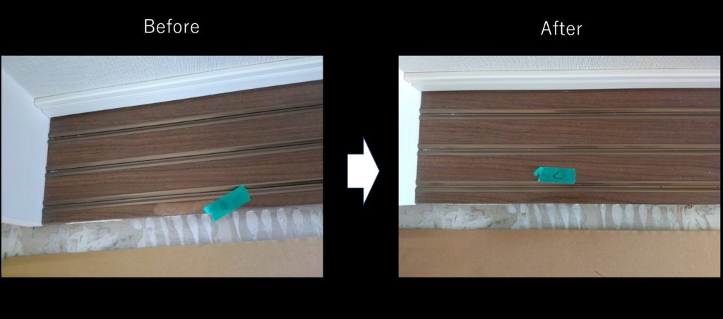もう1つの事例はこちら。こちらは建具のレールがえぐれてしまっています。原状回復工事ではこのような傷も次の入居者のために、補修することが多いのです。こちらも、えぐれた部分がきれいになっています。