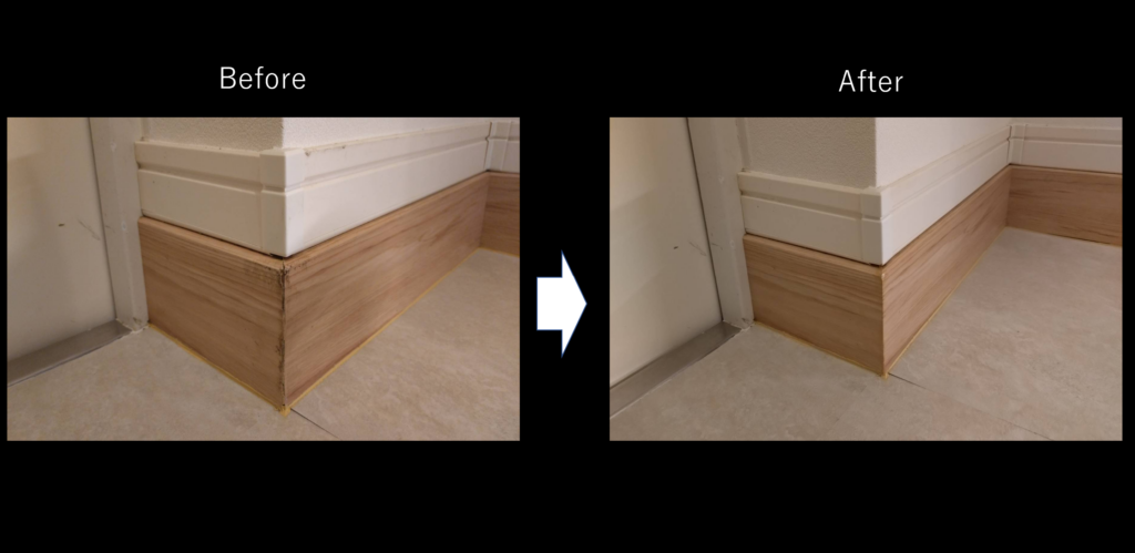 1つ目は、巾木の角がめくれてしまっていて見た目が良くない現場です。弊社のリペア職人(パートナー)に依頼すれば、ご覧の通り!パッと見てどこを補修したかわからないぐらいキレイな仕上がりになっています。